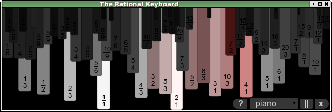 The Rational Keyboard is an HTML5 web app demonstrating a consonance model in just intonation. It's kind of like a piano with infinitely many keys (one for each rational number) that move around and resize based on what sounds good. |